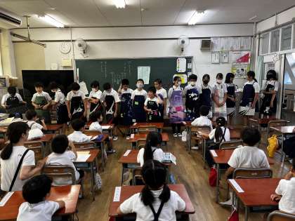 家庭科の時間に作ったエプロンを1年生にお披露目する機会がありました。
