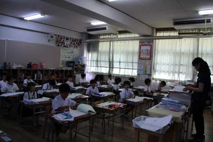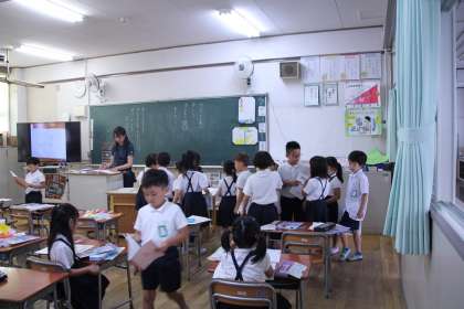 「夏の友」をもらって、夏休みの過ごし方や課題について、先生からお話を聞きました。