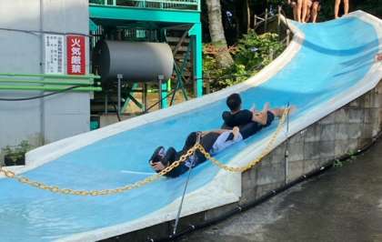 魚つかみをした後、魚が焼けるまでの間、ウォータースライダーで楽しんでいます。
