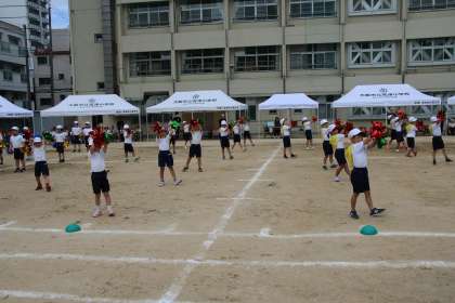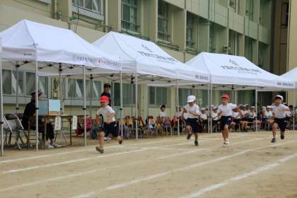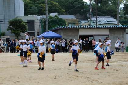 続いては、1・2年生の個人走「ドキドキ☆よーいドン」、団体演技「こころおどる♡」です。