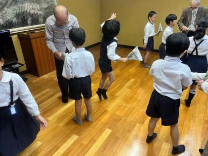 開会式から始まり、新聞紙で紙鉄砲とかぶとの作り方を教えていただきました。