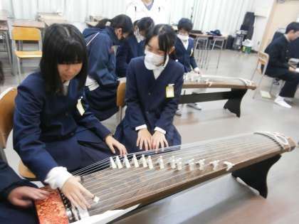 音楽科では琴に挑戦です。琴の仕組みや奏法を教わり、50分後には「千本桜」を演奏できるようになっていました。