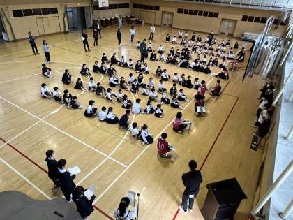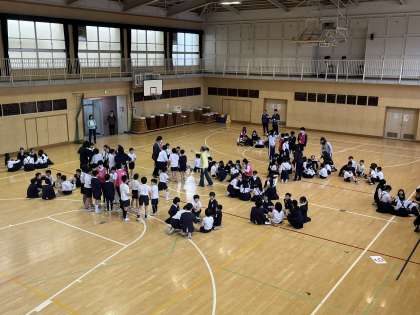 集会委員会が司会となり、縦割り班で「学校へ行こうよ!」のゲームをしました。