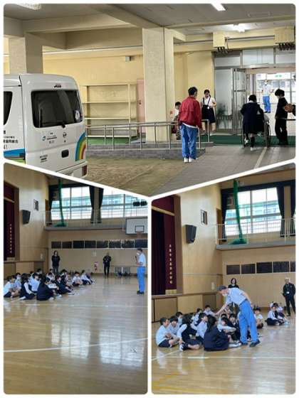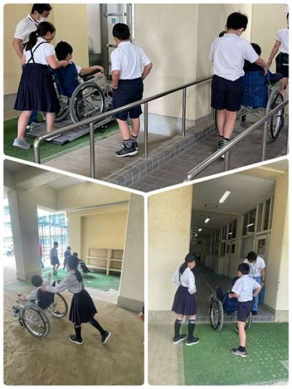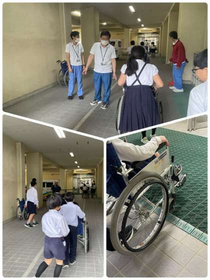 3時間目は、自走体験をしました。4時間目は、ピロティで介助体験しました。少しの段差や傾きのあるところは、難しかったです。
