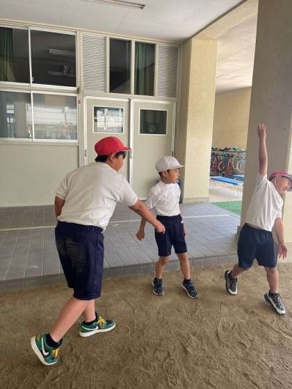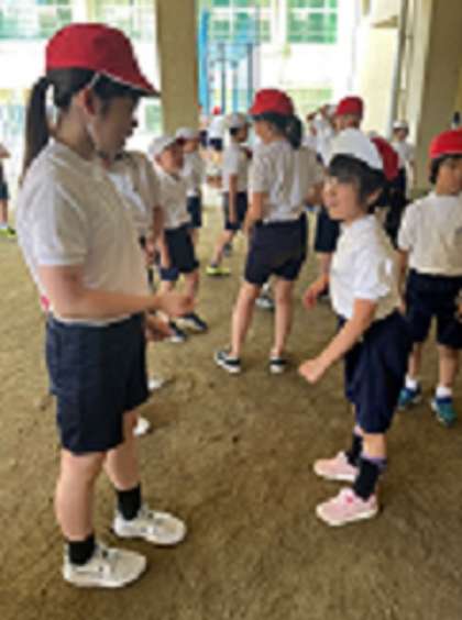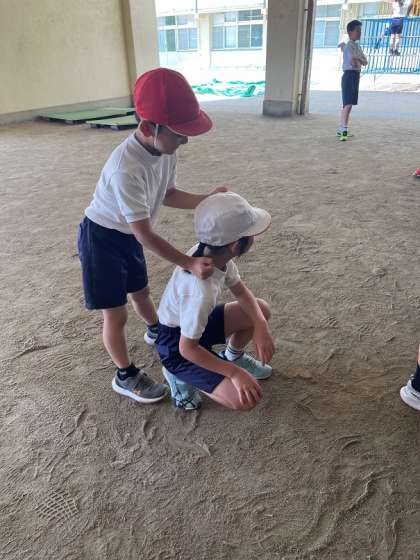 体力テストでの前回での交流「シャトルラン」から今回は「ソフトボール投げ」をしました。初めに、5年生が2年生に投げ方を教えました。「あまり自信がないんだけど。」と言いながら5年生は2年生にどう言ってあげたら分かりやすいかなあと考えながらアドバイスをしていました。また、2年生は5年生のアドバイスを一生懸命聞きながら練習しました。その後、「ソフトボール投げ」の測定を5年生からしました。5年生の遠くに投げる様子を見て「わあー。」と声を挙げる2年生。続いて2年生は5年生に教えてもらったホームを思い出しながら懸命にボールを投げていました。その後は、前回同様のお楽しみ「ふれあいタイム」。ジャンケンをして2年生が勝ったら5年生におんぶをしてもらい、5年生が勝ったら2年生が肩をトントン。楽しい時間が過ごせました。