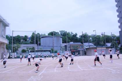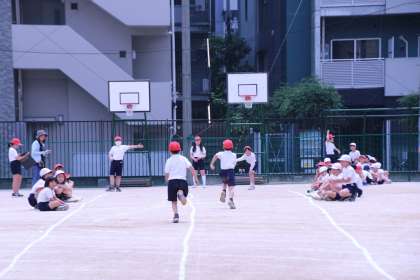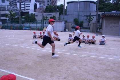 続いて、5年生の番です。よーい、ドン!の合図とともに、遠くの方からぐんぐん近づいてくる5年生の姿をみて、「わあ、速いなあ!」と、2年生は感心した様子でした。