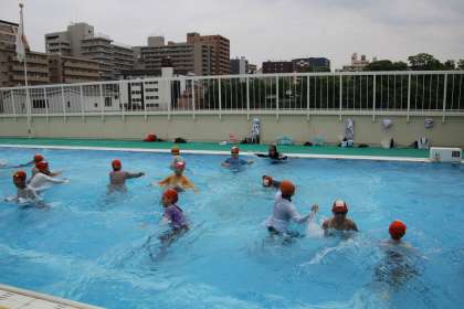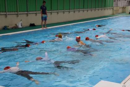 着衣泳とは、実際に服を着たままで水の中に入るとどんな風に感じるのか、またその中で命が助かるためには口を水中の外に出して浮くということをの大切さについて学びました。