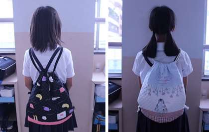 1枚の布を縫っていくと、だんだん袋の形になってきて…仕上げに口の部分に紐を通して完成です!