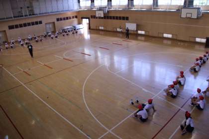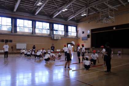 思い切り力を発揮するためには、ルールを守って安全に取り組むことが大切です。立ち位置や棒の持ち方など、細かなところも確認します。