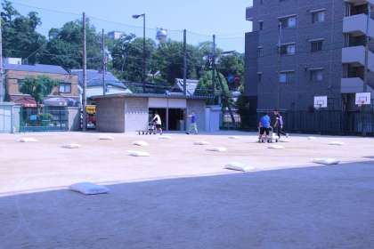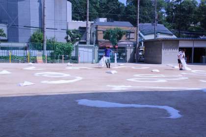 運動場に、にがりを撒きました。こうすると、土や砂が湿気を帯びて舞い上がりにくくなります。運動場は一面真っ白になりました。
