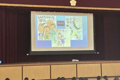 図書委員会の委員会発表では、くすのきしげのり作の絵本『おこだでませんように』を中心に、作家さんで本を選んでみませんかとよびかける発表を行いました。