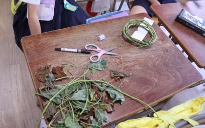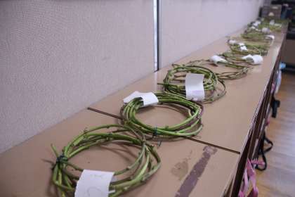葉をとって、ぐるぐると巻いていきます。輪っかが広がっていかないようにしっかりと持って、上手にできました。