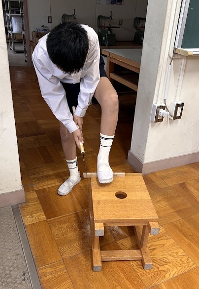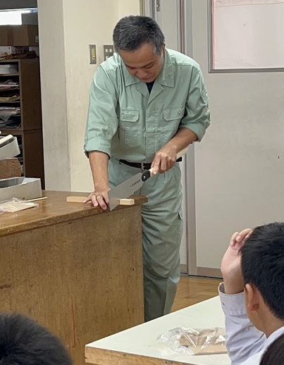 今日は、初めてのこぎりを使うので、管理作業員さんにのこぎりを使うときに気をつけることを教えていただいたり、実際に切り方を見せていただきました。