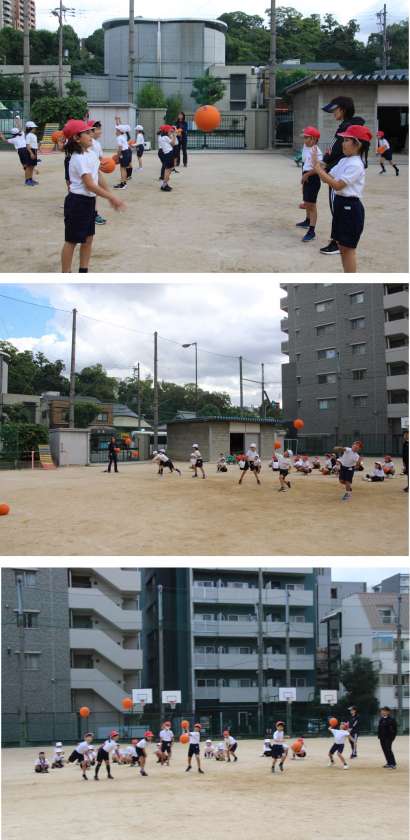 相手のところへボールを投げる練習をしました。なかなか、力加減が難しそうです。でも、何度か繰り返すうちに、じょうずに投げられるようになりました。