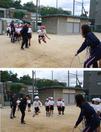 最後に、遠くを目指して力いっぱいボールを投げたあとは、最近クラスで取り組んでいる長なわ跳びです。タイミングがつかめてきて、続けて跳べる回数が増えてきます。