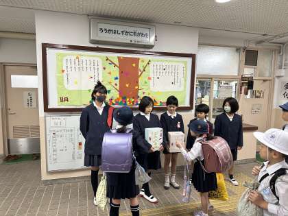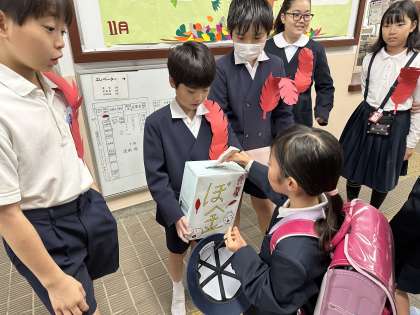 運営委員さんが毎朝玄関に立って声掛けをしています。たくさんの児童が募金を行ってくれています。