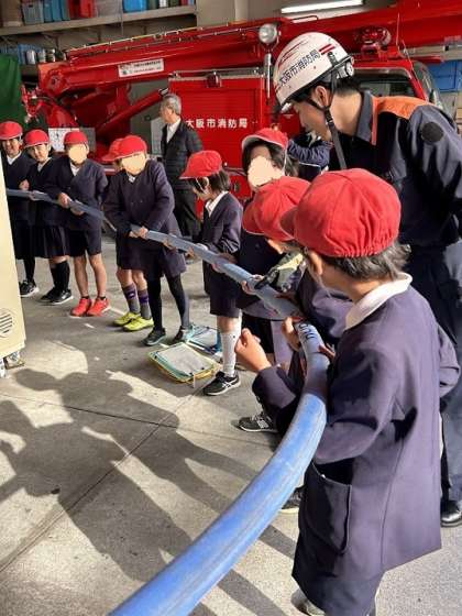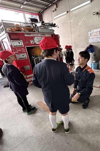 合図の音が鳴ると素早く着替える様子やホースから水を出す様子を見せていただきました。消防車や救急車が並ぶなか、ホースにも触らせてもらい水の勢いを感じることができました。