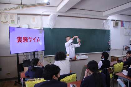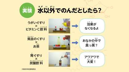 薬を飲む時には、コップ半分の水かぬるま湯で飲む、決められた量を決められた時間に飲むことが大事です。実験タイムでは、ジュースと薬が混ざると、泡が出たり、色が変わったりしました。水以外の飲み物で薬を飲むと薬効が変わってしまうことがわかりました。