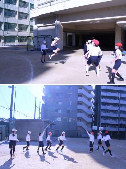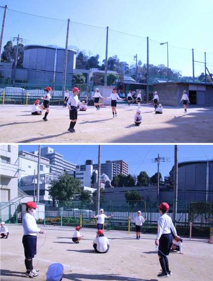 前跳び持久対決や8の字跳びをグループでしました。それから、3分間走です。