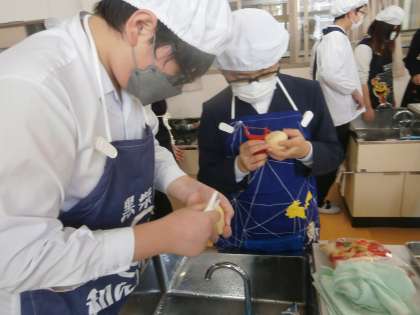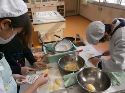 1月24日(金)、6年生が家庭科「こんだてを工夫して」の学習で調理実習を行いました。じゃがいも・ベーコン・チーズ・片栗粉これらの材料を使って、「あと1品作るとしたら…?」をグループで話し合い、ガレットや揚げ焼き、じゃがいもとベーコンのチーズ焼きなど様々な料理を協力して作りました。どのグループもとても美味しく上手に作れていたので、家庭生活でもぜひ実践してほしいと思います。