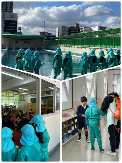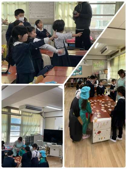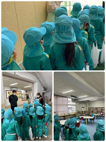 つばな保育園の年長組の皆さんが、学校見学に来てくれました。たくさんの教室や図書館、プールなどを見学しました。1年生と昔遊びで交流もしました。入学まであと少しです。