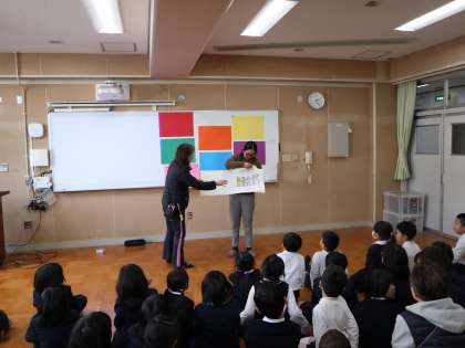 今日は、1・2年生で一緒に外国語活動を行いました。C-NETの先生に挨拶の仕方や数の数え方、体の部分、色について教えてもらいました。教えてもらった英語を使って歌を歌ったり、ゲームをしたりして、子どもたちはすごく楽しそうでした。
