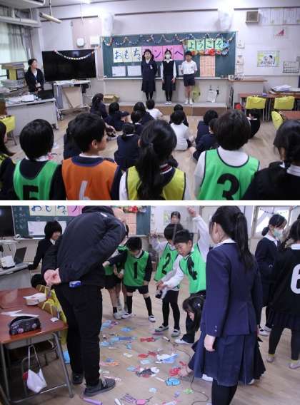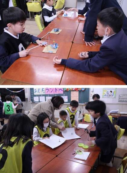 理科で学習したゴムの力、電気、磁石、音の性質。それらを使って作ったおもちゃがたくさんの「おもちゃランド」へ2年生を招待しました。司会や遊び方の説明など、全部自分たちで進めます。