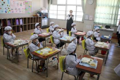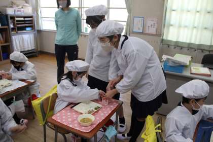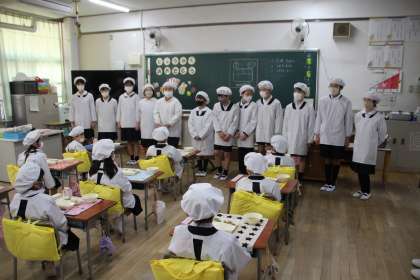 今日は、1年生にとって初めての給食の日でした。今日の献立は、「豚肉のしょうが焼き」「とうふのみそ汁」「じゃこピーマン」です。6年生が給食を配膳してくれたり、牛乳のストローのさし方を教えてくれたりしました。先生や6年生の話をしっかり聞きながら、楽しく給食の時間を過ごしました。