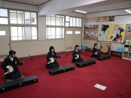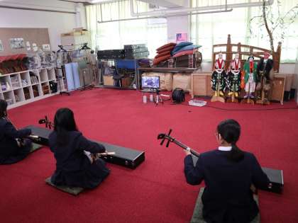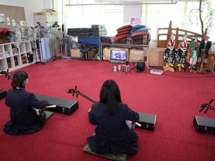 まずは、自分たちで調律をします。友達の弦をはじく音に耳を澄ませながら、自分の三味線の音を合わせていきます。その後は、「二人三番叟(ににんさんばそう)」の練習です。お手本の映像を見たり、グループで課題を出し合ったりしながら、協力して練習に励んでいました。