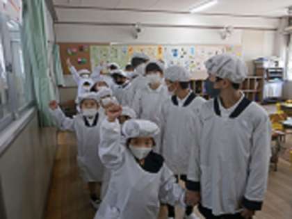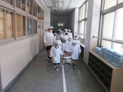 それぞれの役割に分かれて給食当番をしました。6年生が軽々と持っていた食器や食缶はずっしりと重かったですが、「1・2・1・2…」「教室までもうちょっとだよ、がんばって。」という掛け声や励ましのおかげで、しっかりと教室まで運ぶことができました。