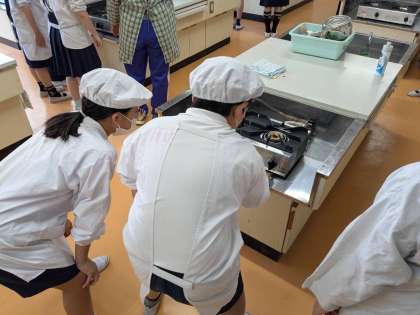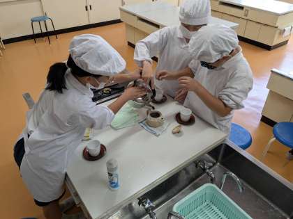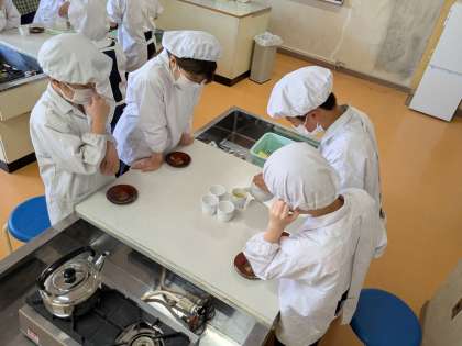 5年生が初めての調理実習を行い、お茶をいれました。はじめに、ガスコンロの安全な使い方を教わって、自分たちでお湯を沸かしました。自分でいれたお茶はとてもおいしく感じたようで、みんなうれしそうに味わっていました。