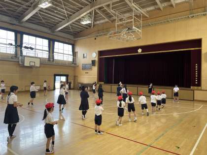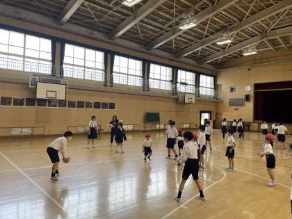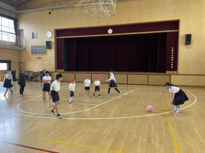 運動委員会の児童が企画した「みんな遊びデー」。1・6年の活動の様子を紹介します。1・6年は、転がしドッジボールを行いました。