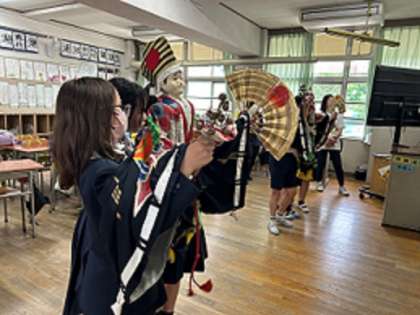 教室では、人形チームが先輩のビデオを見て練習をしています。