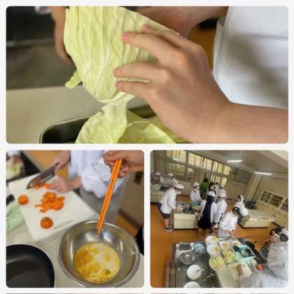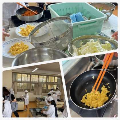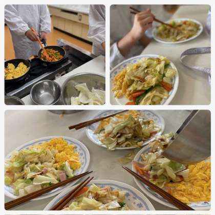 今日は、調理実習です。野菜炒めとスクランブルエッグをつくりました。どのグループも美味しくつくることができました。