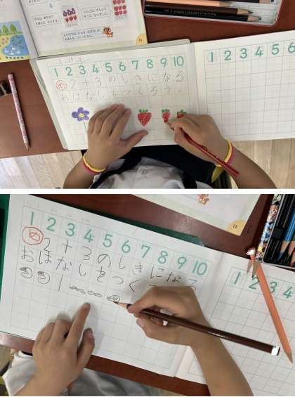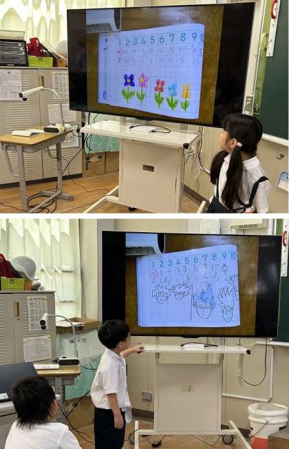 たし算で表せる場面を考え、発表しています。「あわせる」「ふえる」の違いを理解してお話を作ることができました。