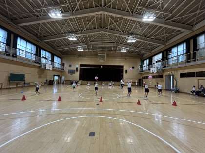 雨でプールに入れなかったので、今日は体育館での学習です。一人でいろいろな体の動きをしたり、二人で協力してボールを運んだりして、楽しく活動しています。