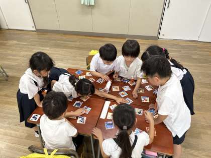 1年生は歌が大好きで、新しい歌でもすぐに覚えて歌っています。今日の音楽は、「たん」と「たた」のリズムを作って遊びました。それぞれが作ったリズムを、4人でつなげていきます。