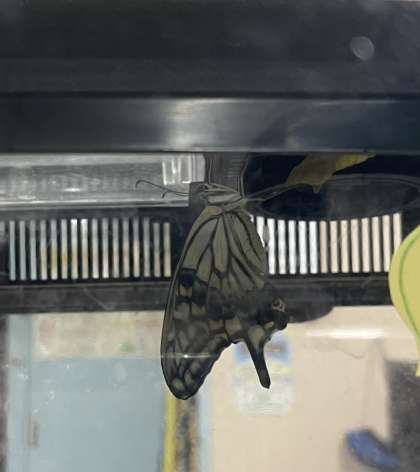 管理作業員さんが大切に育ててくださっていたアゲハ蝶が、ついに羽化し、今日、元気に大空へ飛び立っていきました。子どもたちにとっても、命の成長を間近で感じられる貴重な体験となりました。