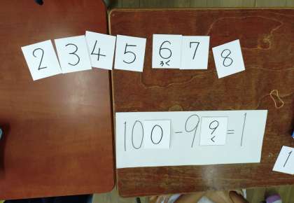 2年生の算数では、3ケタ-2ケタの計算で引かれる数の十の位が0の計算の仕方を学習しました。数字カードを使うことで、興味をもって取り組むことができました。
