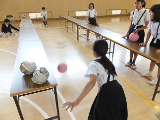 6年生が「たからさがし」「コイン落としゲーム」「記憶ゲーム」「ボーリング」「空き缶おとし」の5つのお店を開きました。