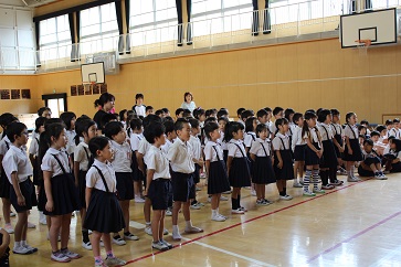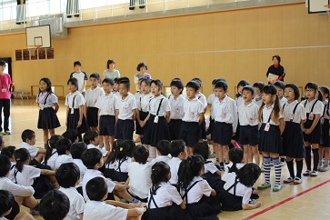 第1回は「あめですよ 」を学年ごとやみんなで音読しました。