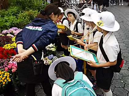 2年生が町たんけんに出かけました。国立文楽劇場を見学した後、黒門市場に行きました。そこで、三都屋(お菓子屋さん)、花とみ(お花屋さん)、石橋食品(お総菜屋さん)を見学させていただきました。大変混雑した中で、子どもたちのインタビューに笑顔でこたえていただきました。大変有意義な時間を過ごすことができました。