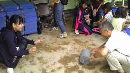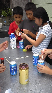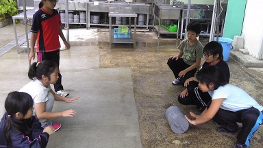 氷を詰めた大筒に容器(アイスクリームのもと)を入れて転がします。