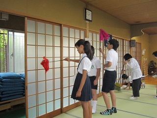 憩いの家で日本家屋の掃除の仕方を学んできました。畳の目に沿って箒や雑巾がけをおこなったり、庭の掃除をしたりするなど、初めて経験する児童も多く、大変勉強になりました。