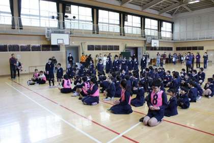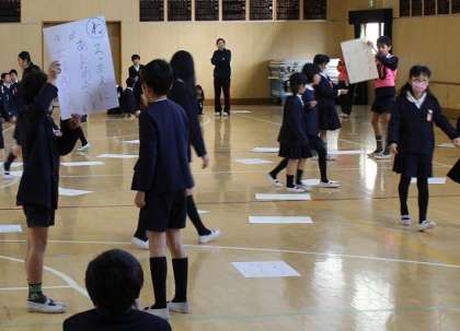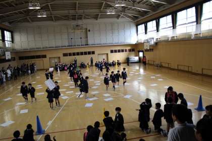 子どもたちが考えた読み札を児童会の運営委員が読み上げ、手作りカルタを班の代表(ペア)が取りに行きました。カルタを取りに行く際には、たてわり班の中で1年と6年、2年と4年、3年と5年というようにペアを作り、異学年が協力して楽しみました。和やかな新年の行事となりました。