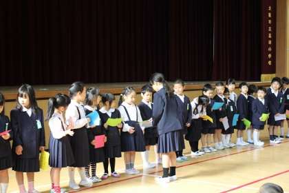 まず、司会の6年生が新一年生の子どもたちの名前を一人一人呼び、「入学おめでとうカード」をプレゼントしました。
