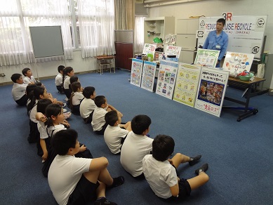 大阪市環境事業局の方に来ていただき、パッカー車が粗大ごみを収集する様子を見学したり、その工夫についてお話を聞いたり実際にごみの分別をしたりして学習しました。