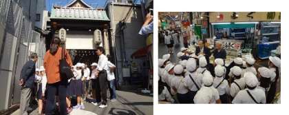 3年生が社会科の学習で黒門市場見学を行いました。まず、黒門市場商店街振興組合理事長・山本善規様からのお話を聴きました。続いて黒門市場内を案内していただき、工夫や特徴、歴史などを詳しく説明していただきました。子どもたちは実際にものを観ながら話を聴くことができるので、実感しながら学習内容を深める見学となりました。