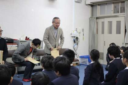続いて、技芸員の先生からは、5年生への励ましの言葉をいただきました。5年生の表情からは、高津小の伝統である文楽学習を受け継ぎ始める事への決意がうかがえました。ピリッと引き締まった良い会になりました。