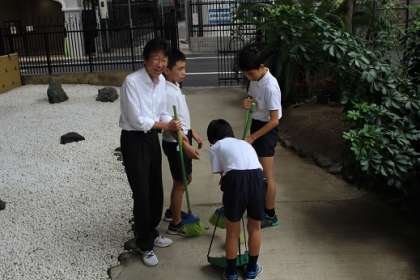 家の内と外を掃除するグループに分かれて取り組みました。畳の目に沿って箒や雑巾がけをおこなったり、庭の掃除をしたりするなど、初めて経験する児童も多く、大変勉強になりました。